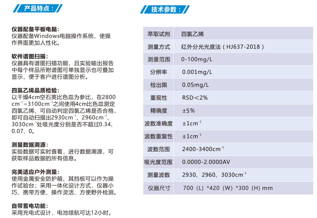 2、以國(guó)家標(biāo)準(zhǔn)方法《海洋 石油開(kāi)發(fā)工業(yè)含油污水分析方法 紅外分光光度法》(GB/T17923-2017)為依據(jù),用四氯乙烯萃取含油污水中的油類物質(zhì),用紅外分光光度計(jì)分別測(cè)定萃取液在2930cm²、2960cm²、3030cm'的吸光值,吸光值大小與油類的濃度成正比。